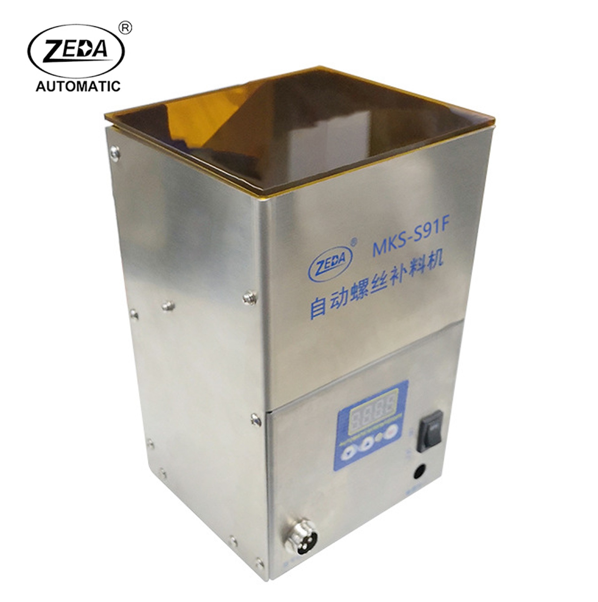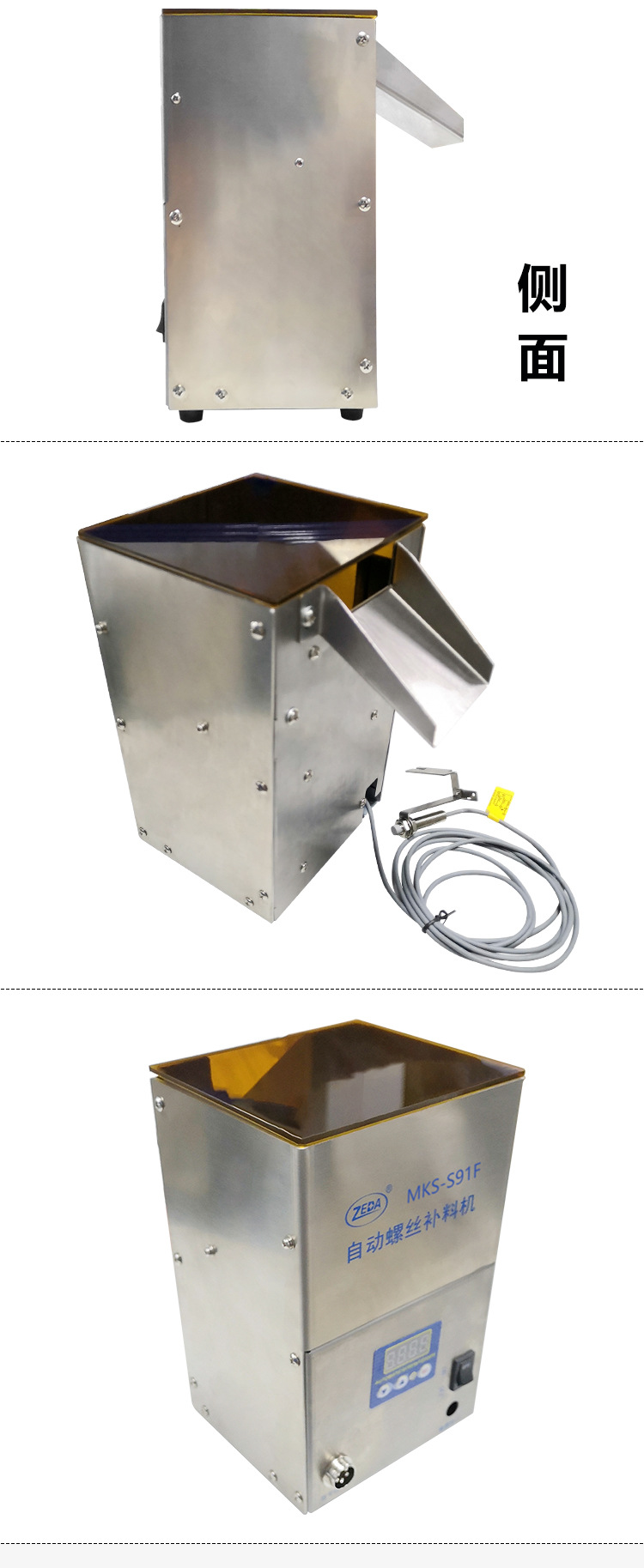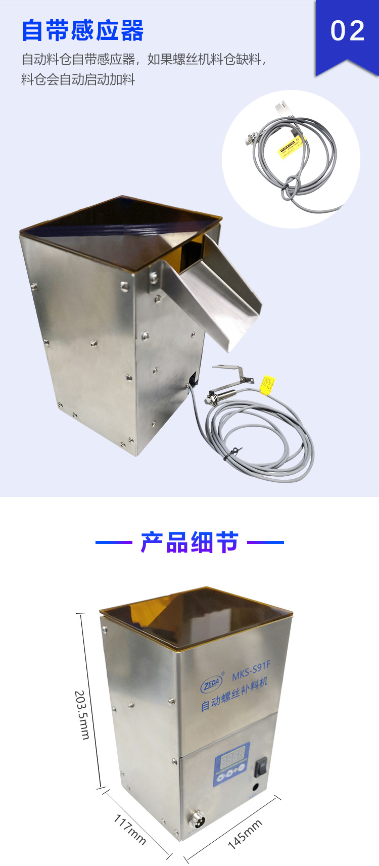 2、自動(dòng)料倉(HOPPER)自帶感應(yīng)器,如果螺絲機(jī)料倉缺料,自動(dòng)料倉會(huì)自動(dòng)啟動(dòng)加料;